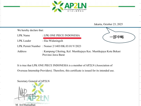 詳しく見る当社インドネシア拠点の送出し機関「ONE PIECE」がこの度、AP2LNのメンバーに承認されました。 AP2LNは、2015年に設⽴されたインドネシア労働省(Ministry of Manpower:MOM)公認の技能実習認定送出機関の協会になります。これにより、ONE PIECEは、以下の特典が見込まれています。 インドネシア国内、および日本での技能実習生に関する最新、有効な情報の適時な入手 日本で技能実習生が問題に直面した場合、適切なサポートも得られる 労働大臣、総局長が出席するイベントにも携われ、送出機関(SO)としての信頼性が向上 インドネシア国内、および日本で開催されるマッチングイベントに優先的に参加