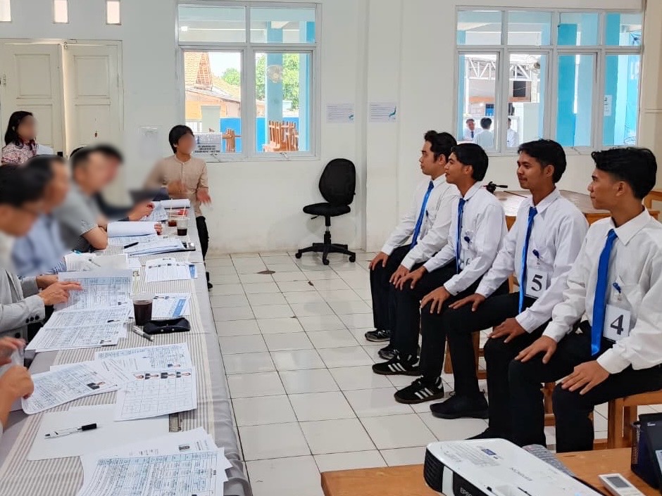 当社インドネシア送出し機関ONE PIECEから約1時間半移動したチカランにある提携先、溶接訓練校で面接を実施しました。 参加者は、数ある候補者の中から経験者、またその中でも日本語能力も充分で、或いは伸びしろがある方を人選。施設内のスペースで対面の面接の他、写真のように、垂直や真横にくっけたりなどの溶接の実技も確認し、合格者を人選しました。